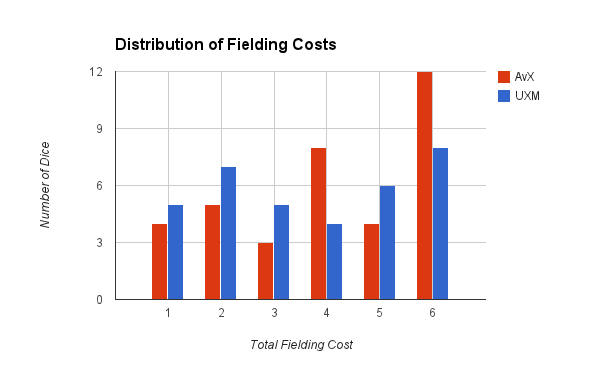 So, first off - the average fielding cost in UXM is about 3.66. That's almost half an energy less than AvX - fairly significant, I'd say. But where, exactly, are our savings coming from? Do we have lots of cheap dice? Very few expensive dice? The answer is yes, to both...sort of.