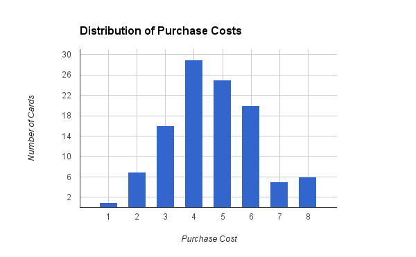 Average purchase cost this time around is 4.67 (4.69 if you include the non-basic actions), slightly higher than UXM - not really a surprise with those 8s weighing down the back end, and with 5s/6s being a good bit more common than 2s/3s. That said, there are a lot of 4 cost cards this time around, suggesting that they want more variety in the first-turn options without necessarily wanting lots of multibuy/'and then I use the Professor X global' possibilities.