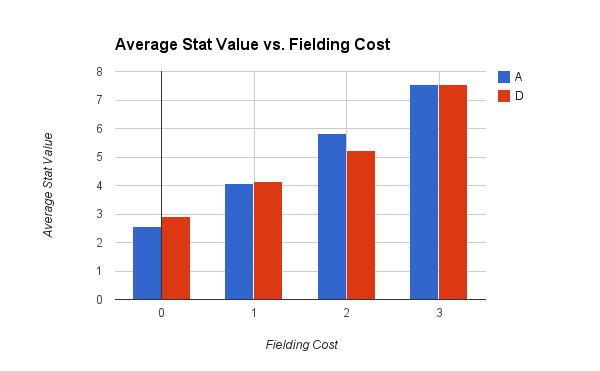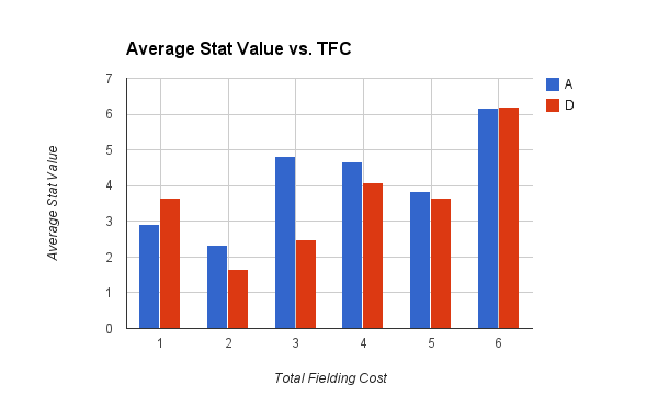 Looking at the 1s, though, there's a near-half point spike in their stats, and similarly for the TFC 6 characters. 4s are the only anomaly in this trend; while their offense is up over half a point, they've lost nearly a point of defense from UXM; taking a look at the UXM characters, though, we see Bishop, Emma Frost, and Iron Man, all fairly tanky characters, making up three of their four, so perhaps that's just a little bit of a bias from the relatively small sample size. Most of the YGO 4s seem to be mid-to-high-range offense-focused dice (with the exception of Harpy Lady, who is a little underwhelming for a TFC4) explaining its offensive bent, and why its defense ended up lower.