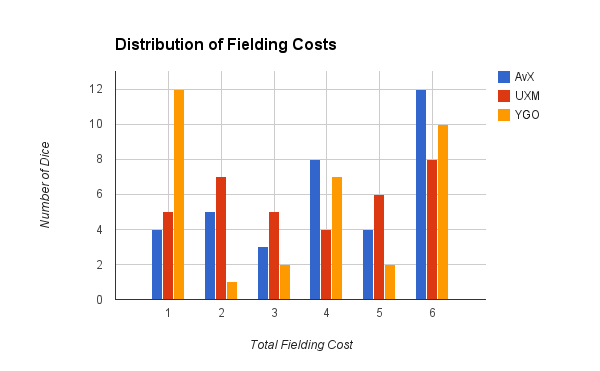 First things first: the average fielding cost in YGO is 3.47, slightly cheaper than UXM but nothing to really talk about a big change one way or the other. When you look at how they're distributed, though...